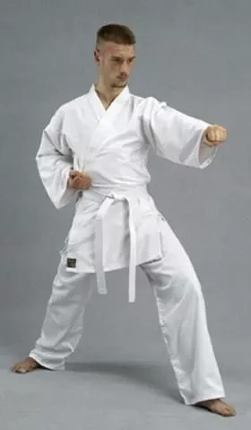 Karaté-gi leger en 100 % coton Veste de coupe traditionnelle Pantalon avec ceinture élastique pratique et laçage supplèmentaire Ceinture blanche comprise Pour commande club rubrique "nous contacter"